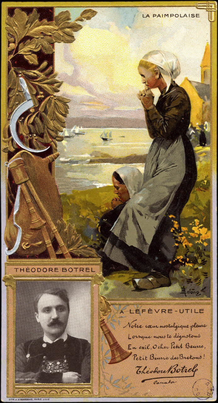 (LITH. J. E. GOOSSENS, PARIS-LILLE (b. g.))(A LEFEVRE-UTILE Notre coeur nostalgique pleure lorsque nous te dégustons en exil. O Cher Petit Beurre Petit Beurre des Bretons ! Théodore Botrel Canada (b. d., texte manuscrit imprimé))(R. Lelong (S. b. d. de la scène centrale))Décor