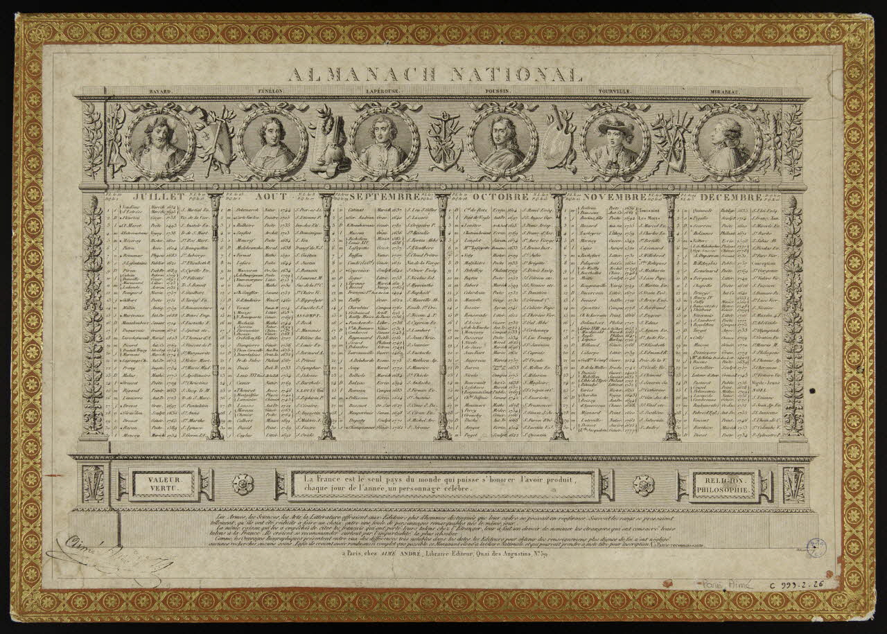 ([calendrier])(La France est le seul pays du monde qui puisse s'honorer d'avoir produit chaque jour de l'année un personnage célèbre (b. m.))(Les Armes, les Sciences, les Arts, la Littérature offraient aux Editeurs plus d'hommes distingués que leur cadre ne pouvait en renfermer (. . .) La Patrie reconnaissante)(à Paris, chez Aimé André, Libraire Editeur, Quai des Augustins, N° 59 (b. m.))Décor
