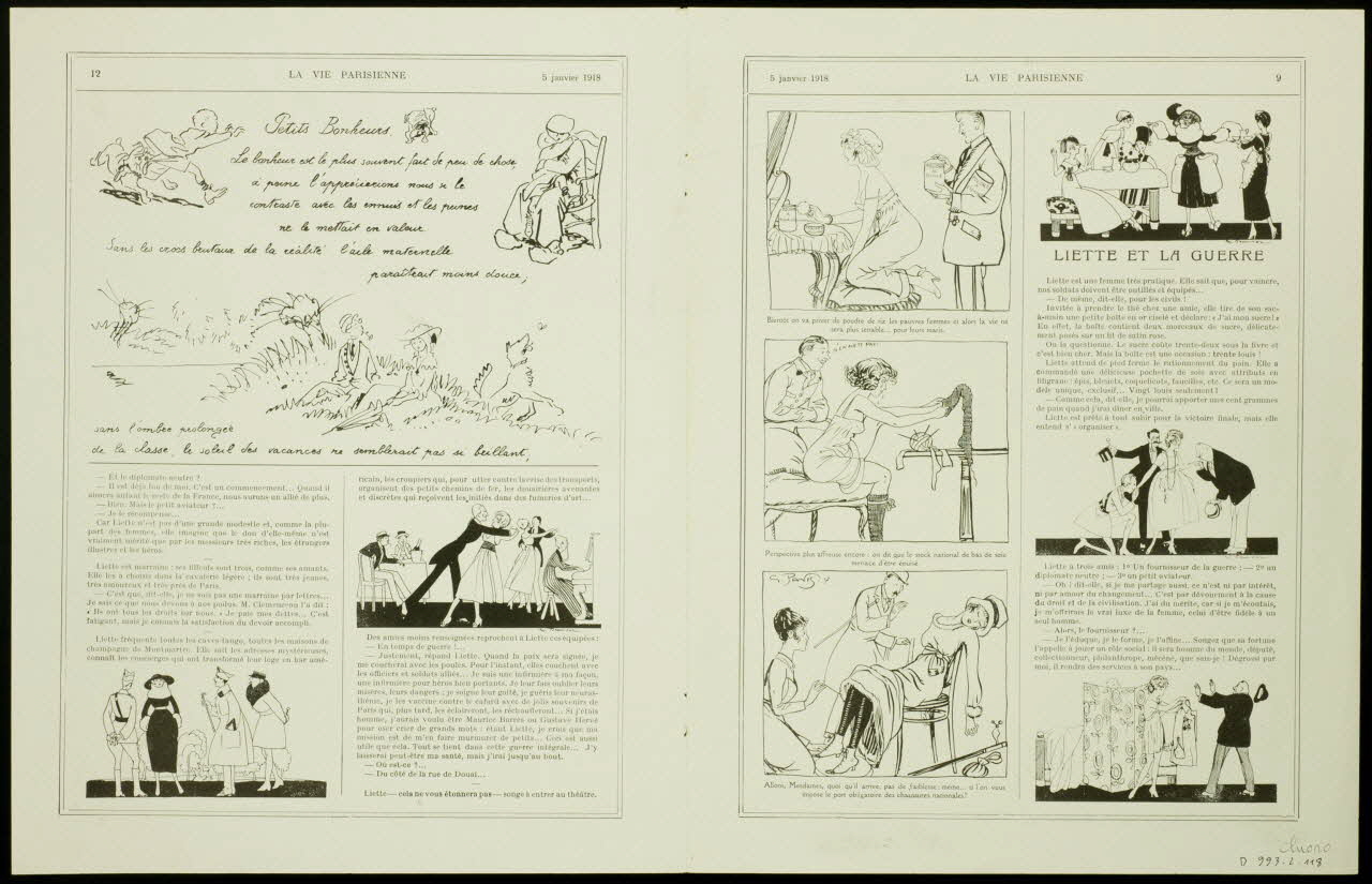 (LA VIE PARISIENNE (h. g.))(POUR L'ANNEE QUI VIENT DE COMMENCER LES GRACES QUE NOUS VOUS SOUHAITONS (h. m.))(Dessins de G. Léonnec (h. d.))(G. L. (M. b. d.))Décor