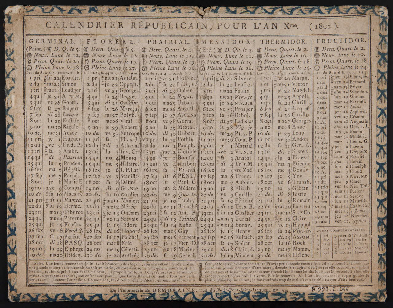imagerie ancienne, calendrier, CALENDRIER REPUBLICAIN POUR L'AN Xme. (1801 ET 1802)