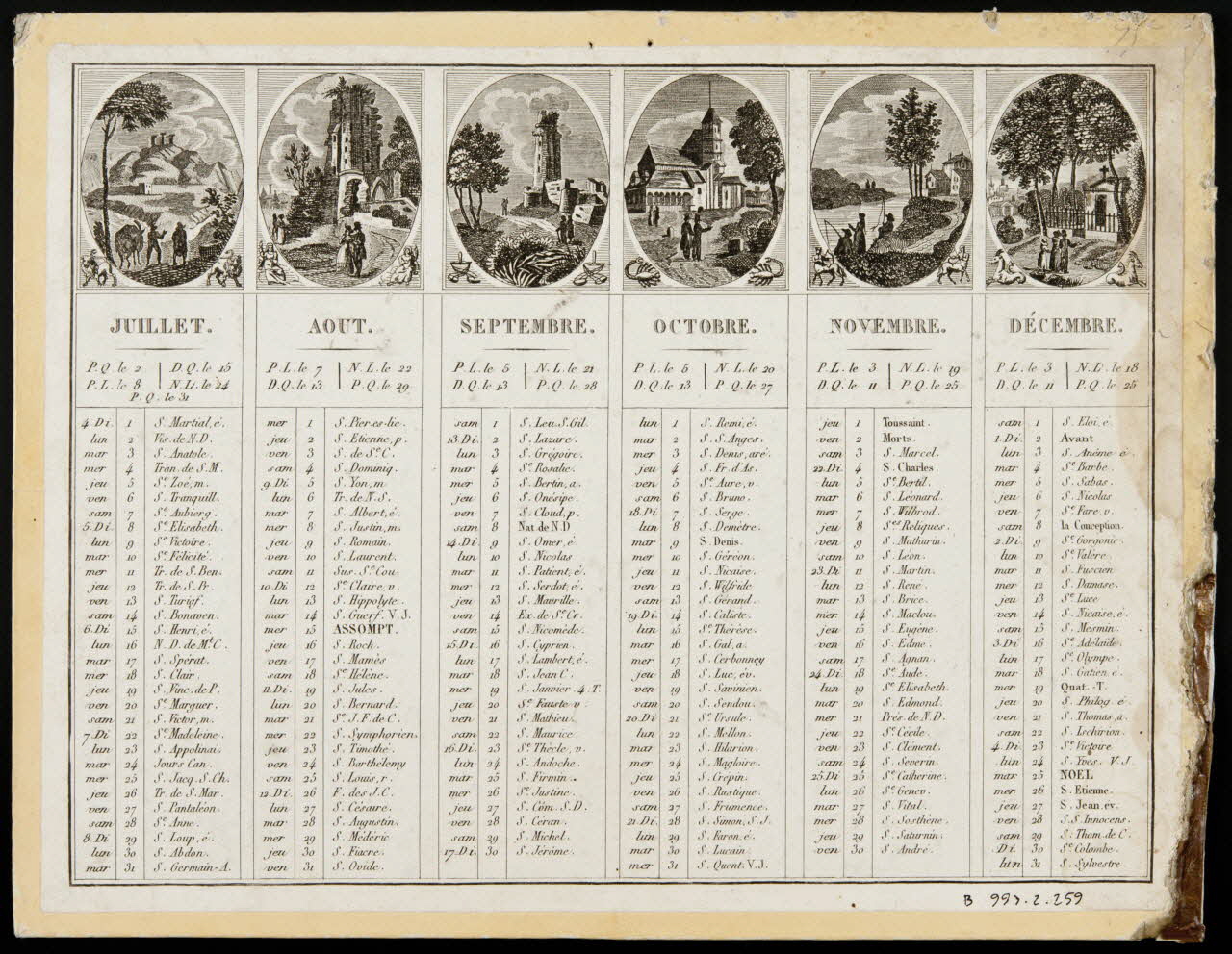 - Paysage : en médaillon, arbre, rivière, tour : télégraphie, moulin, château, parc, signe du zodiaque