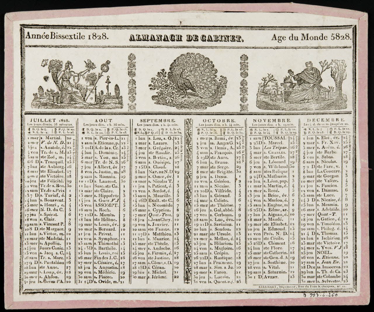 (Année Bissextile 1828 (h. g.))(Age du Monde 5828 (h. d.))(Paris, Chez CAILLOT, Libraire, rue Saint-André-des-Arcs (sic), No 57 (b. d.))(EBERHART, Imprimeur, Rue du Foin S. -Jacques, no 12 (revers, b. d.))Décor