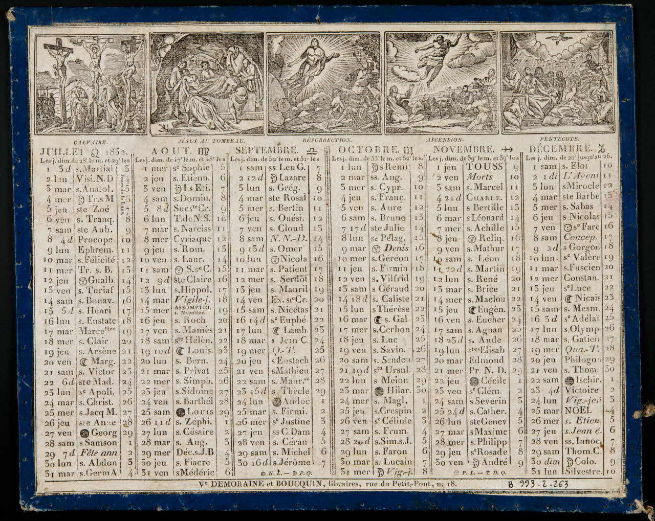 (CENE (h. g.))(JESUS AU JARDIN DES OLIVIERS (h. m.))(JESUS DEVANT PILATE (h. d.))(JESUS FLAGELLE (h. d.))(CALVAIRE (revers, h. g.))(JESUS AU TOMBEAU (revers)(h. g.))(RESURRECTION (revers, h. m.))(ASCENSION (revers, h. d.))(PENTECOTE (revers, h. d.))(Ve DEMORAINE et BOUCQUIN, libraire, rue du Petit-Pont, n. 18 (b. m.))Décor