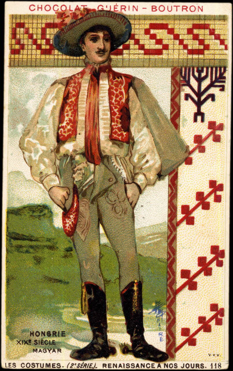 - Représentation humaine : homme, moustache, en pied, de face, vêtement : Hongrie, 19e siècle, chapeau, cravate, pantalon, botte