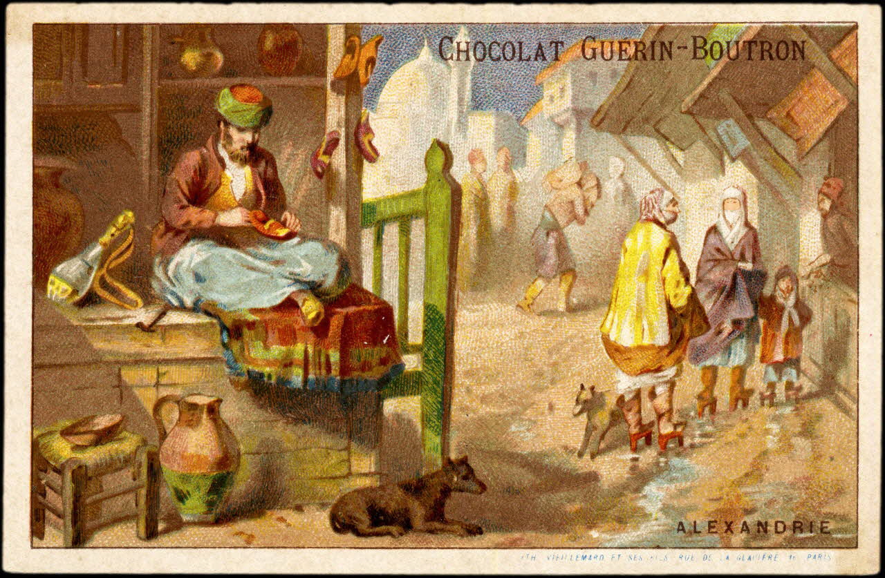 - Scène : Egypte, Alexandrie, Egyptien, marché, cordonnier : marchand, magasin, récipient : terre, chaussure