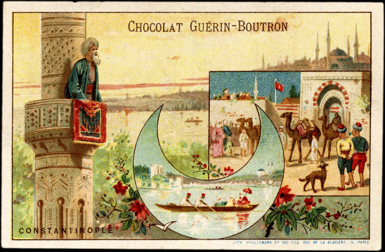- Scène : homme : chant, appel, minaret, cathédrale : sainte Sophie, Constantinople, mer, homme, barque, rame, nappe d'eau, porte : ville, chameau, homme, chien