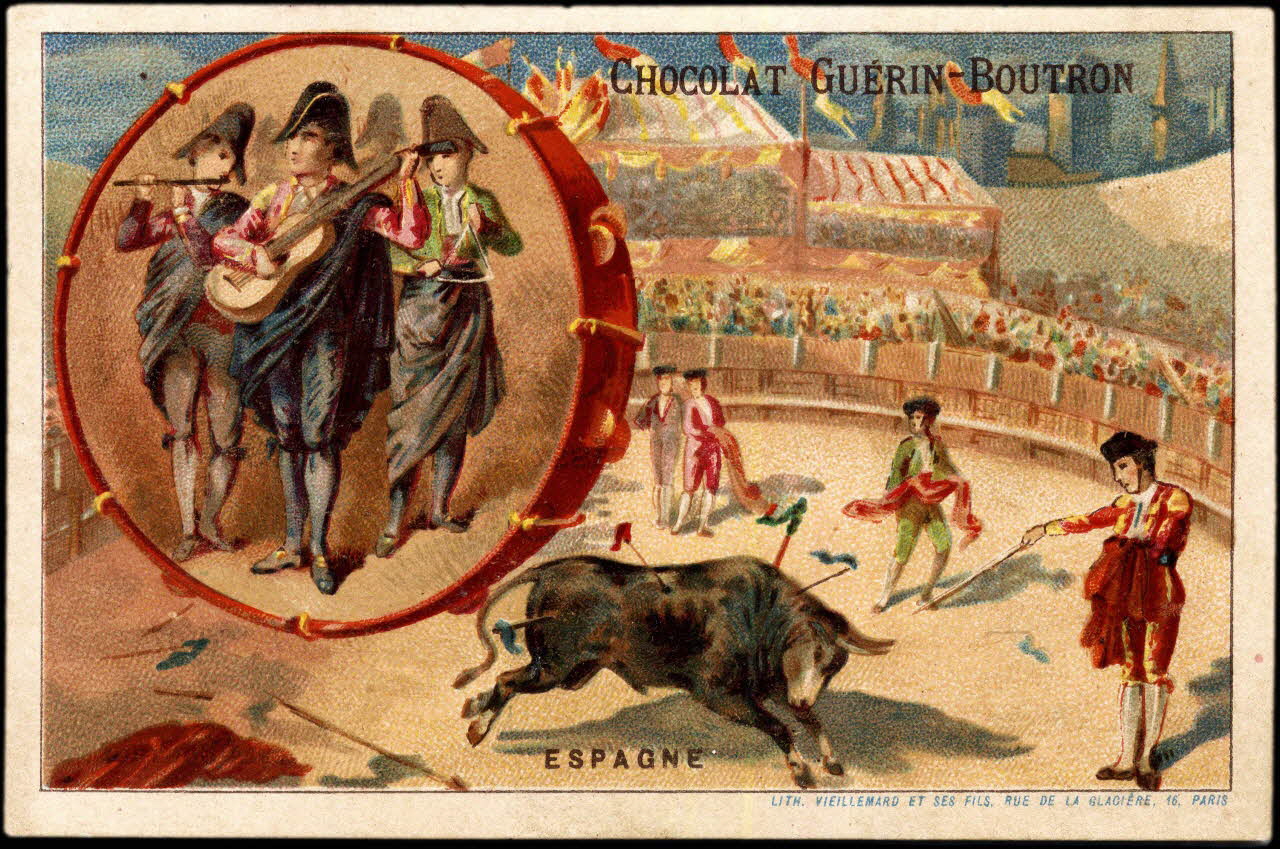 - Scène : musicien, guitare, flûte à bec, le triangle, tauromachie, homme : torero, taureau, spectateur