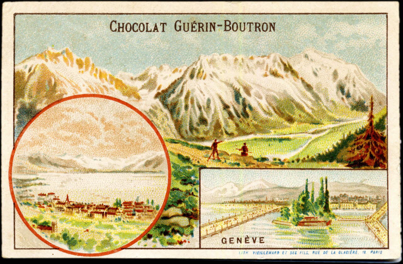 Représentation d'une chaîne montagneuse ; puis d'une ville au bord d'un lac ; enfin dela ville de Genève.Inscriptions