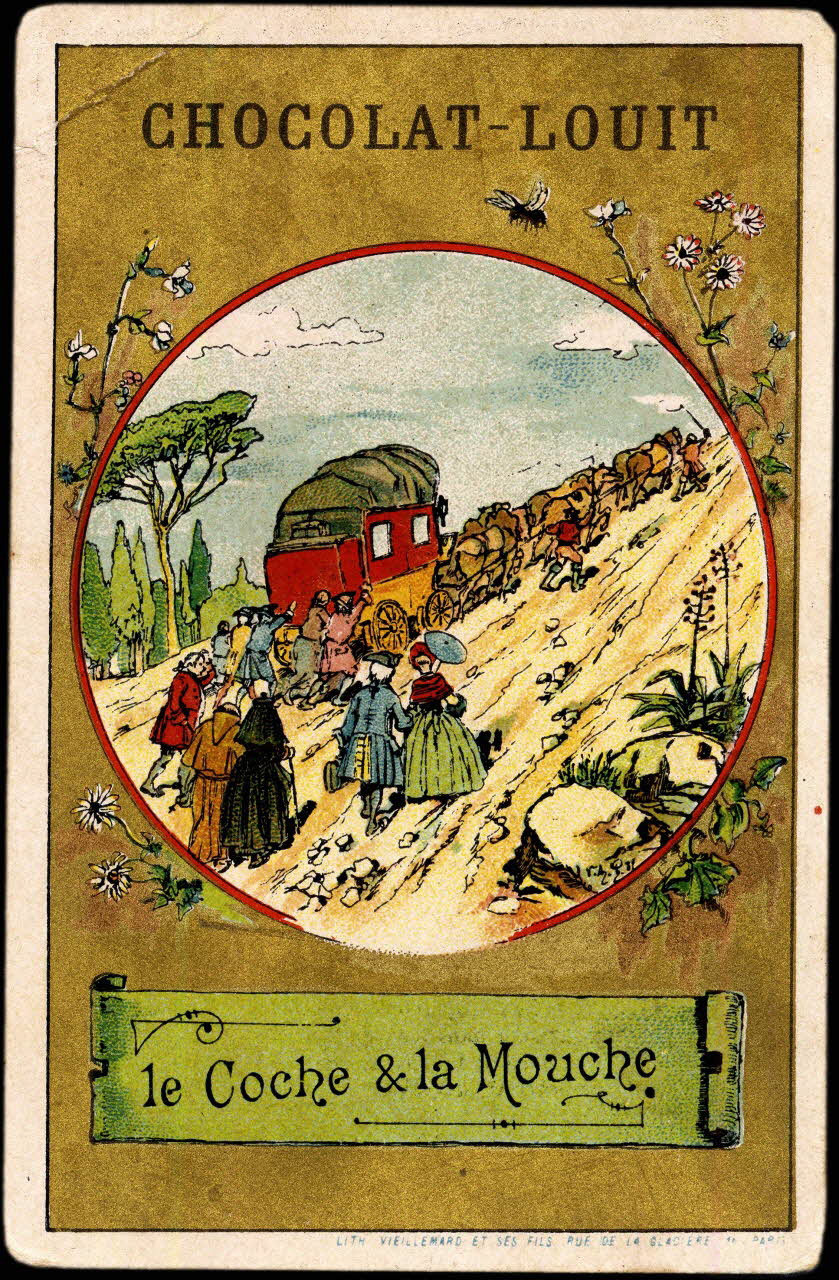 Une diligence essait de gravir une montée suivie derrière elle par les passagers à pied.Inscriptions