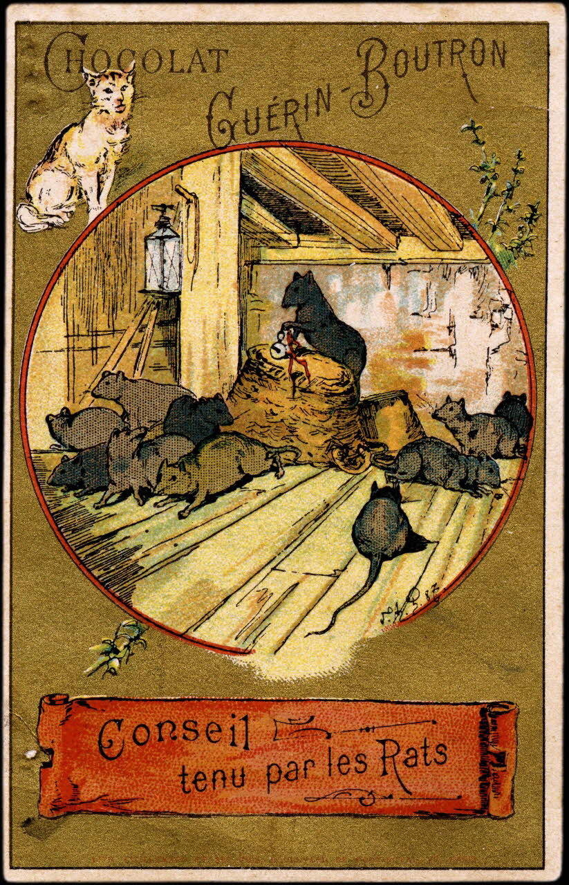 Un rat est monté sur un panier renversé tandis que d'autres rats sont autour de lui.Inscriptions