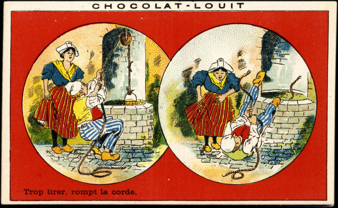 carte réclame, chromo, Trop tirer, rompt la corde.