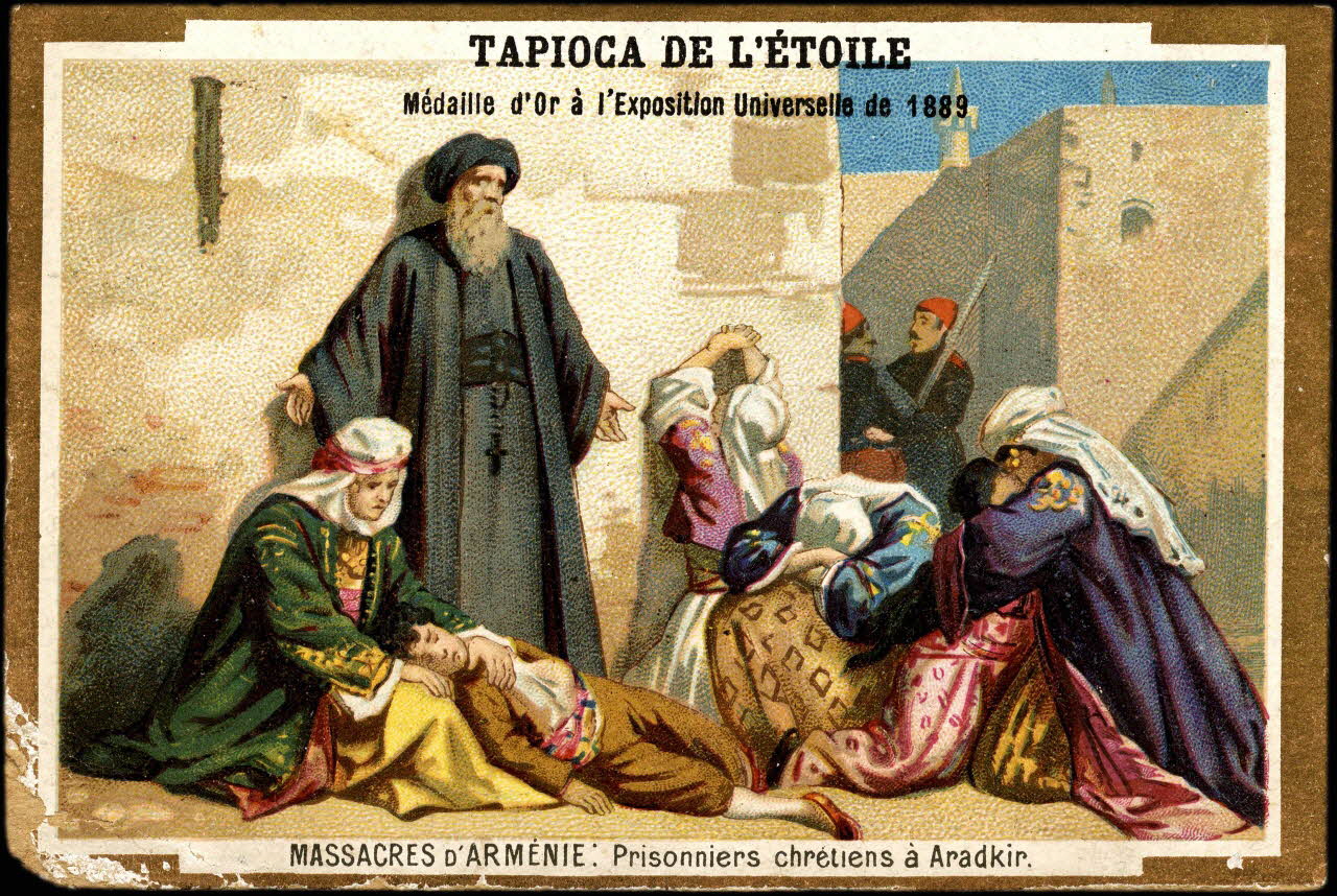 Massacre d'Arménie : un pope est au milieu de femmes arméniennes désespérées, tous sont prisonniers des turcs qui gardent la prison.Inscriptions