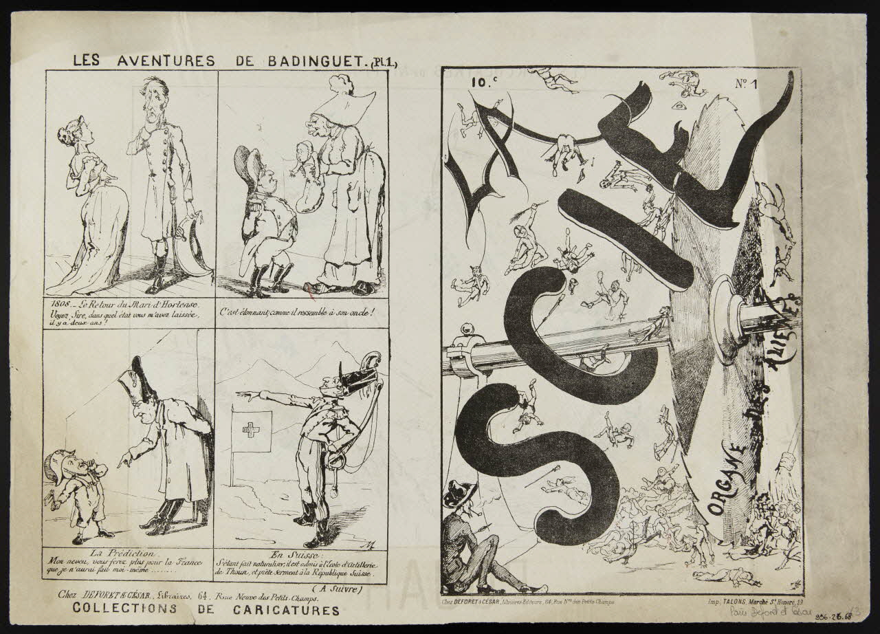 - Scène : satirique, Thiers Louis Adolphe, corps : hibou, miroir, effet de soleil, lettre, plume, encrier, sang, femme, Marianne, assis, nu, draperie : à l'antique, bonnet phrygien, champ : bataille, soldat : France, satirique, Empereur de France, uniforme : général : époque Premier Empire, nourrisson, femme, désigner, satirique, Napoléon Ier, uniforme : général : époque Premier Empire, enfant, désigner, satirique, Suisse, drapeau : Suisse, homme, uniforme : armée, satirique, sciage, homme, soldat, en vol, balai, homme, femme, Napoléon III, assis, fumeur, pipe