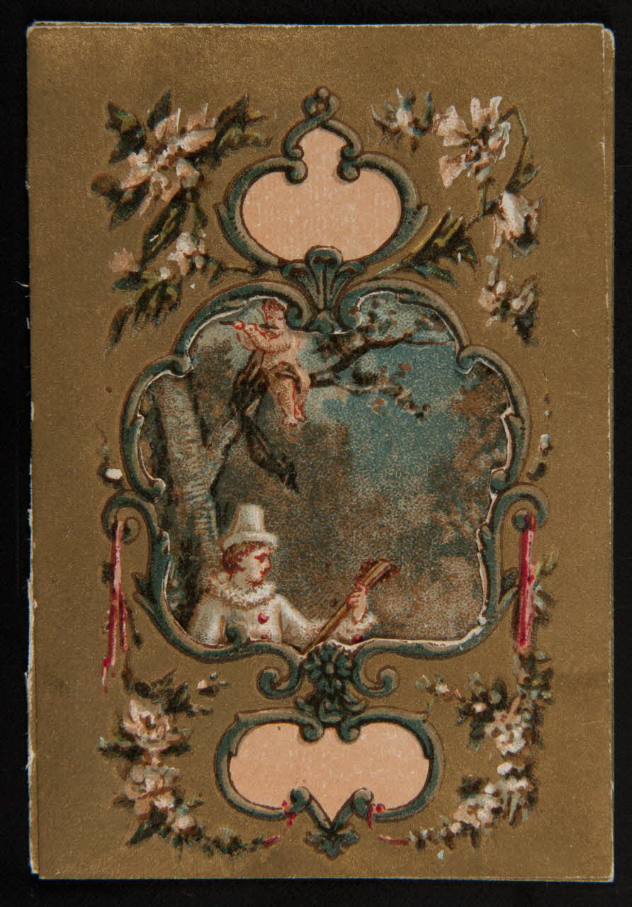 Un Pierrot assis sous un arbre joue de la guitare. Dans les branches, un putto joue de la flûte. Représentation d'un cartouche orné de rinceau et de fleurs.Décor