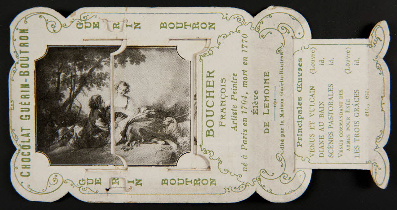 (GUERIN BOUTRON (m. d.))(GUERIN BOUTRON (m. g.))(Elève de LEMOINE / Edité par la Maison Guérin-Boutron (b. m.))(Principales oeuvres / VENUS ET VULCAIN (. . .) LES TROIS GRACES (b. m.))(CHOCOLAT GUERIN-BOUTRON (. . .) PARIS (revers))(LEOPOLD VERGER ET CIE. Imp. PARIS (b. g., revers))(Breveté SGDG (b. m., revers))Décor