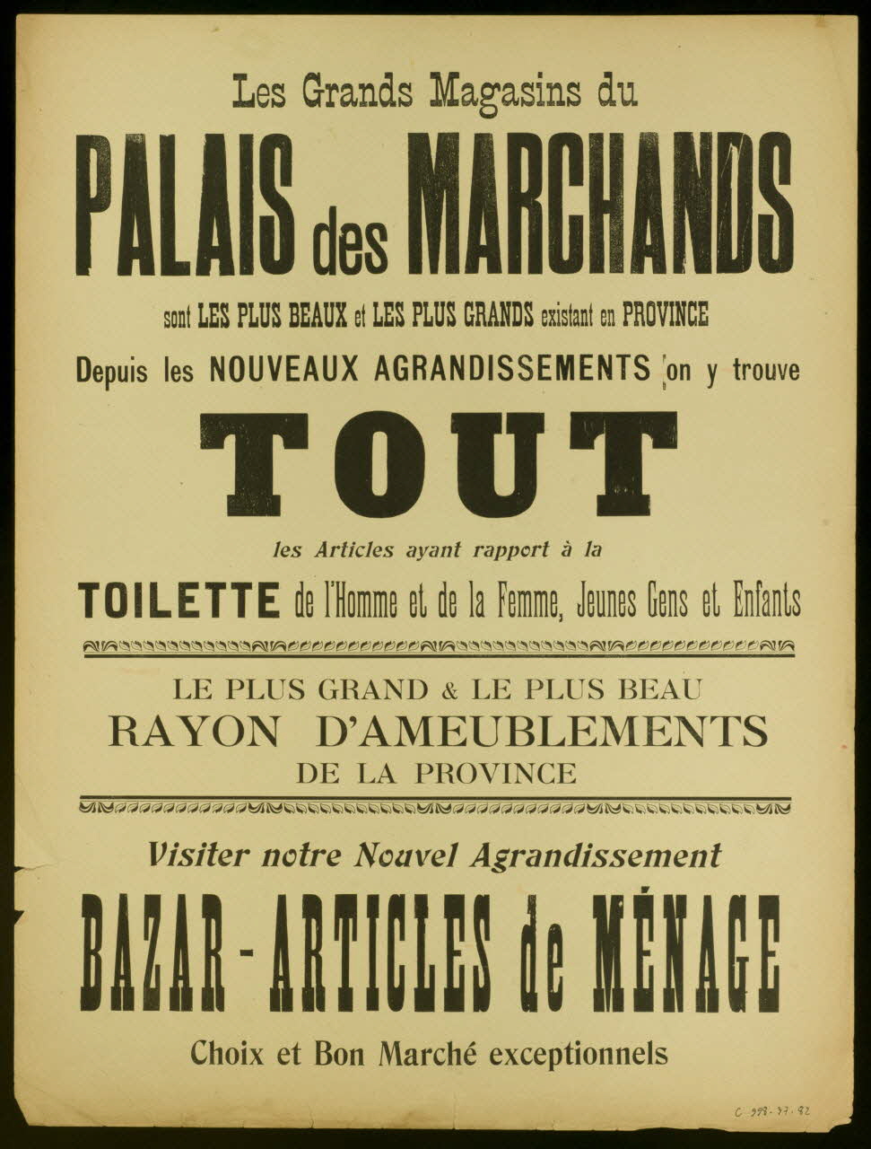 (M. Crapaudin veut faire restaurer sa maison (. . .) Plutôt que de revoir jamais des peintres chez lui, M. Crapaudin préférera laisser sa maison à moitié badigeonnée)(Les Grands Magasins du / PALAIS des MARCHANDS / sont LES PLUS BEAUX et LES PLUS GRANDS existant en PROVINCE (. . .) Choix et Bon Marché exceptionnels (revers))Décor