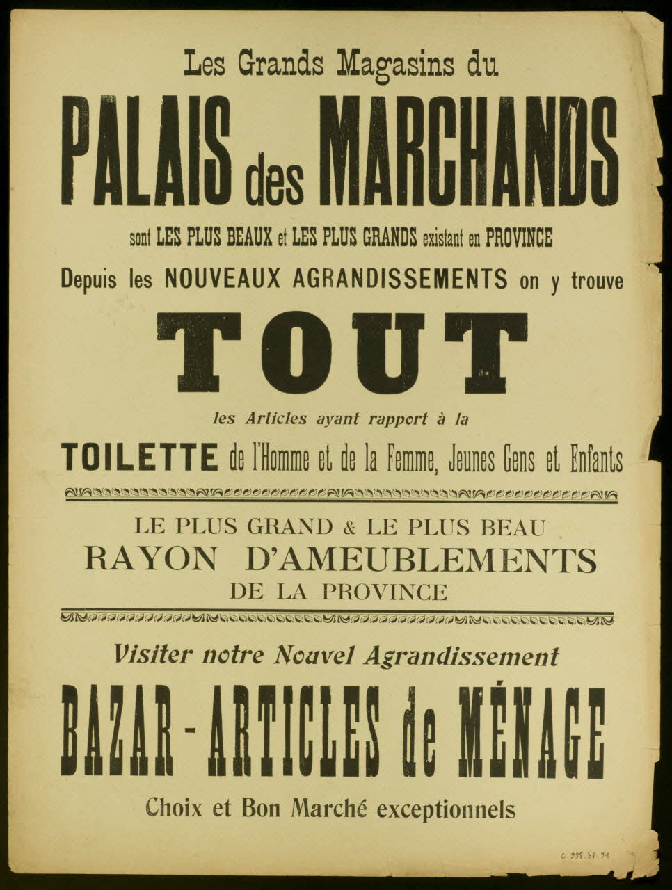 (Toi, ma vieille, t'as une tête à payer demi-litre (. . .) Où qu'il est passé ? - Hé, le m'sieu ! ta pipe !)(Les Grands Magasins du / PALAIS des MARCHANDS / sont LES PLUS BEAUX et LES PLUS GRANDS existant en PROVINCE (. . .) Choix et Bon Marché exceptionnels (revers))Décor