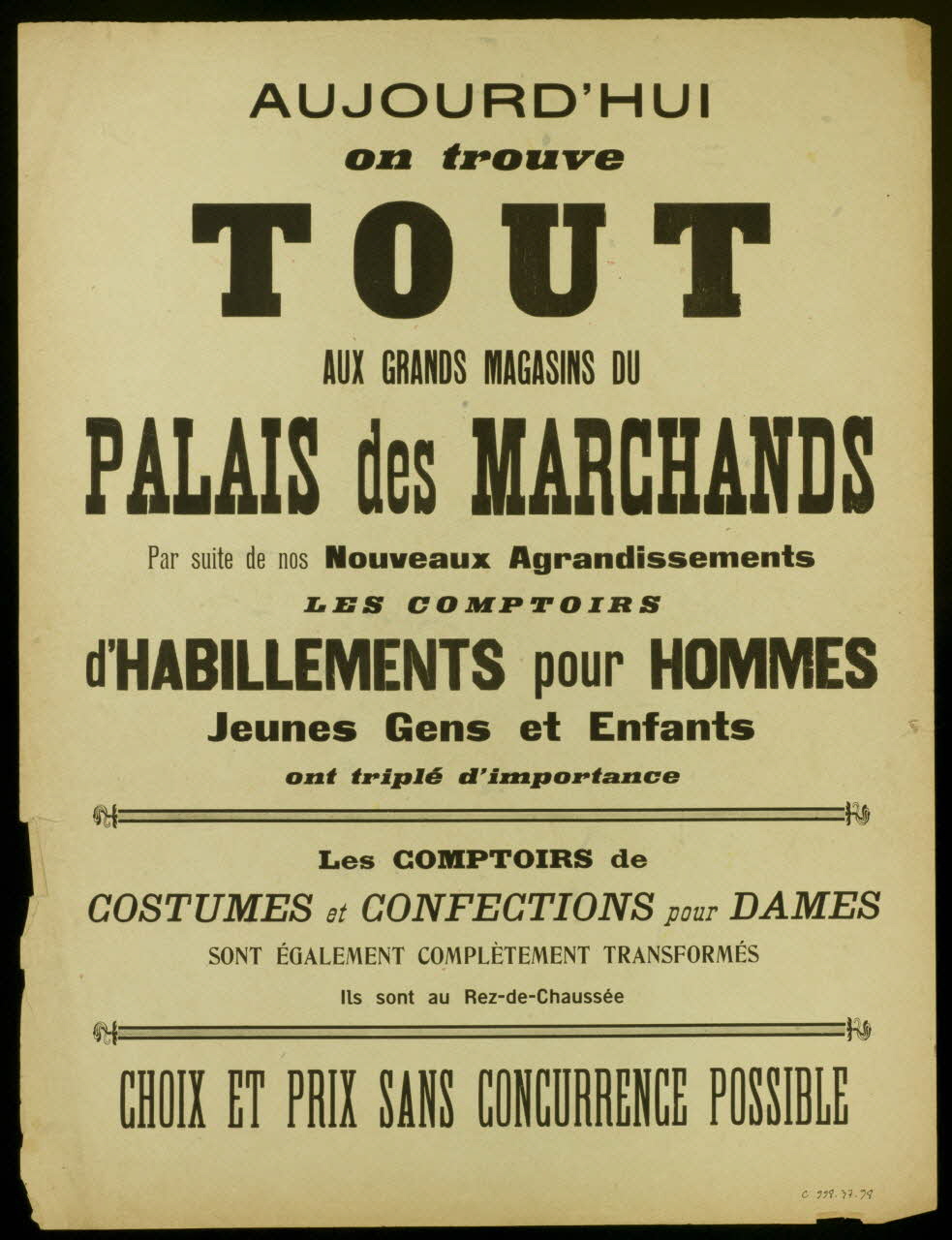 (Deux négociants en bric-à-brac presque ruinés, n'ayant plus même de marchandises, se lamentent (. . .) Tout de même, se disent-ils, heureusement qu'il y a musique et musique, et que, si certaine adoucit es moeurs à dire de proverbe, il en est une autre qui arrive à merveille à les exaspérer, et, celle-là, nous la connaissons !)(AUJOURD'HUI / on trouve / TOUT / AUX GRANDS MAGASINS DU / PALAIS des MARCHANDS (. . .) CHOIX ET PRIX SANS CONCURRENCE POSSIBLE (revers))Décor