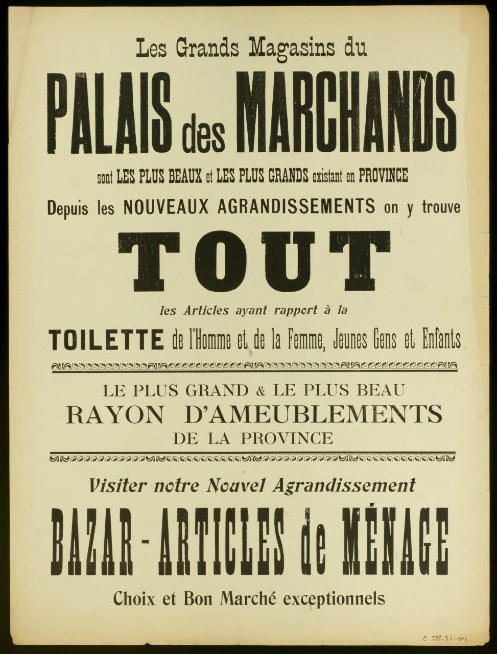 (Le vicomte Simplice de Fond-Percé, jeune homme très bécarre, après avoir dévoré un certain nombre de billets de mille, se voit dans la dure nécessité de réduire ses frais de loyer (. . .) te v'là logé . . . et c't'appartement-là, qui pu est, j'te l'offre gratis !)(Les Grands Magasins du / PALAIS des MARCHANDS / sont LES PLUS BEAUX et LES PLUS GRANDS existant en PROVINCE (. . .) Choix et Bon Marché exceptionnels (revers))Décor