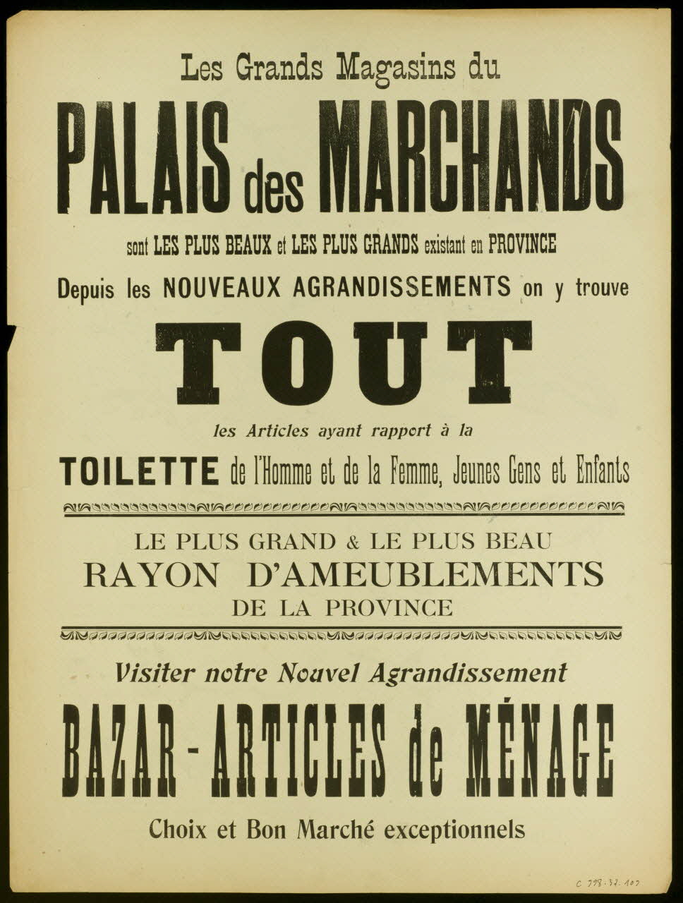 (O'Galop (S. b. d.))(Prenons que vous avez affaire à l'être de tous le plus entêté, parmi les espèces inférieures. J'ai nommé le baudet (. . .) Soit dit sans offenser les masses par une comparaison évidemment outrée, savoir retourner sa veste à propos est encore le seul moyen qui ait été éprouvé efficace pour les diriger)(Les Grands Magasins du / PALAIS des MARCHANDS / sont LES PLUS BEAUX et LES PLUS GRANDS existant en PROVINCE (. . .) Choix et Bon Marché exceptionnels (revers))Décor
