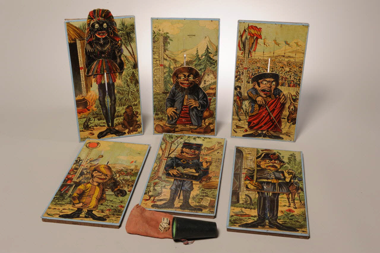 2001.7.1.1 et 2 : boîte 2001.7.1.3 à 8 : planches de jeu avec figures mobiles 1 gobelet à dés en carton vert non marqué 2 dés non marqués 1 bourse à jetons en tissu rose non marquée 43 jetons de couleurs non marquésDécor