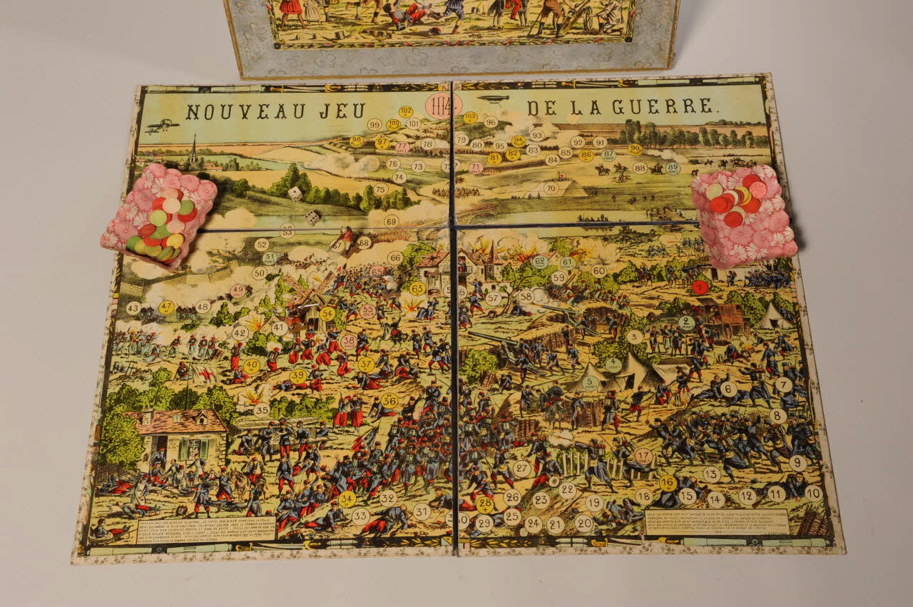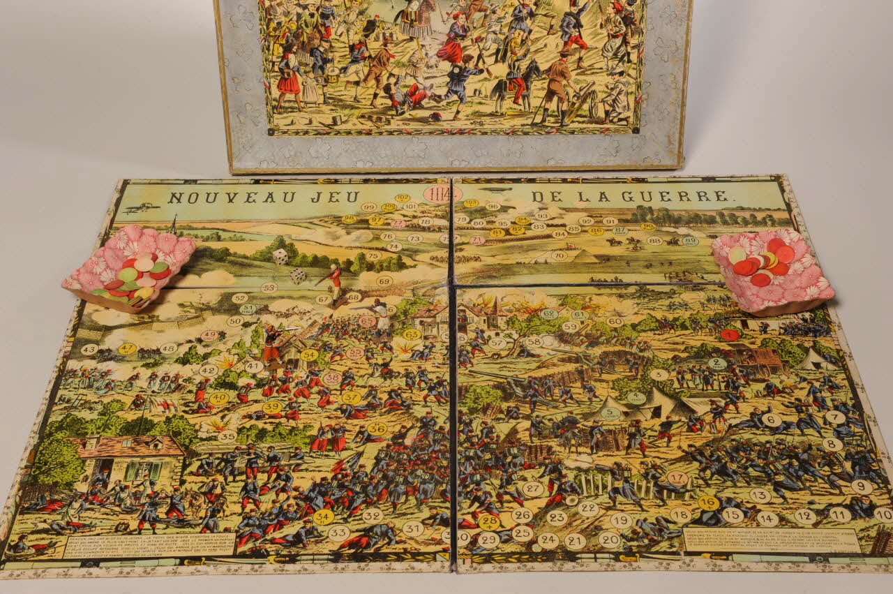 2001.7.1 et 2 : boîte 1 plateau de jeu non marqué 2 dés non marqués 2 corbeilles en carton rose à jetons non marquées 3 pions figurines de militaires en métal non marqués 50 jetons de couleur non marquésDécor