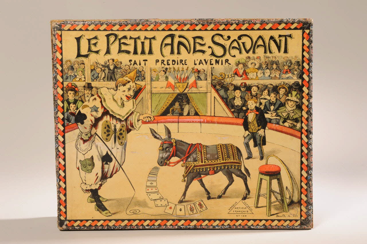- Scène : cirque, spectateur, clown, montre d'animaux : âne, drapeau : France, jeu de cartes, divination, tabouret, fouet