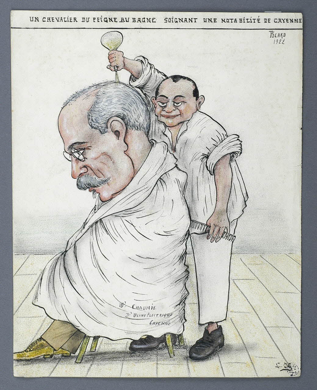 Le bagnard Picard coiffe M. Chaumie, directeur de l'usine électrique de Cayenne.Inscriptions