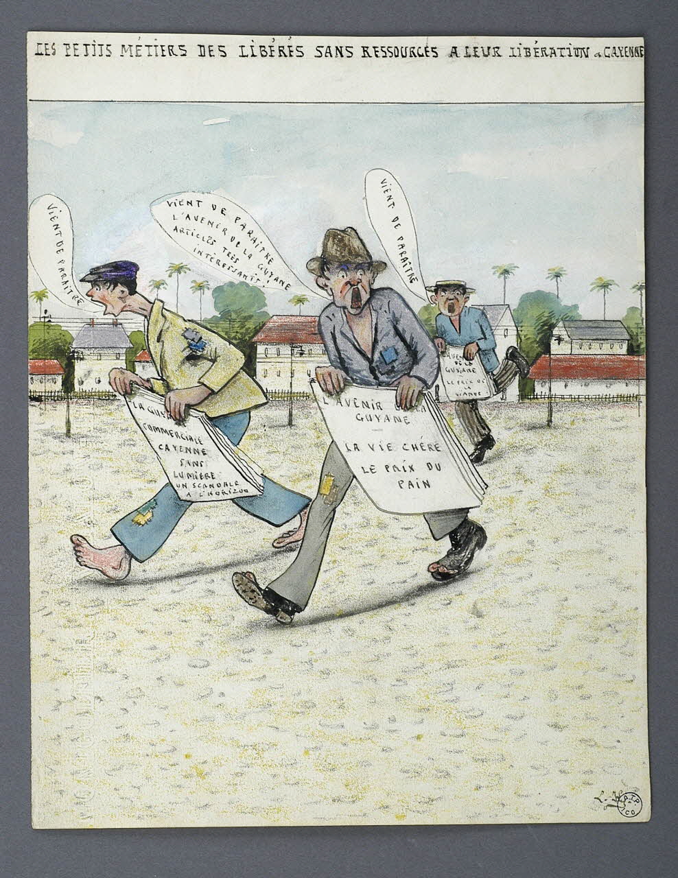 - Scène : satirique, bagne : Guyane française, Cayenne, prisonnier, liberté, pauvre, vente, journal, place, maison