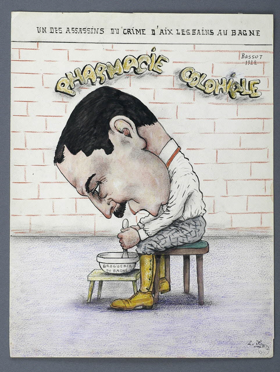 Portrait charge d'un criminel nommé Bassot préparant un poison dans un mortier.Inscriptions
