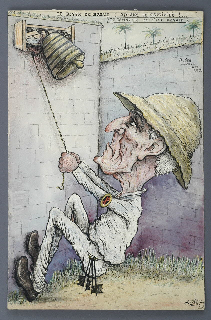 - Portrait charge : bagne : Guyane française, de profil, en pied, grossissement : tête, prisonnier, vieux, sonneur, chapeau : paille, cloche, clé