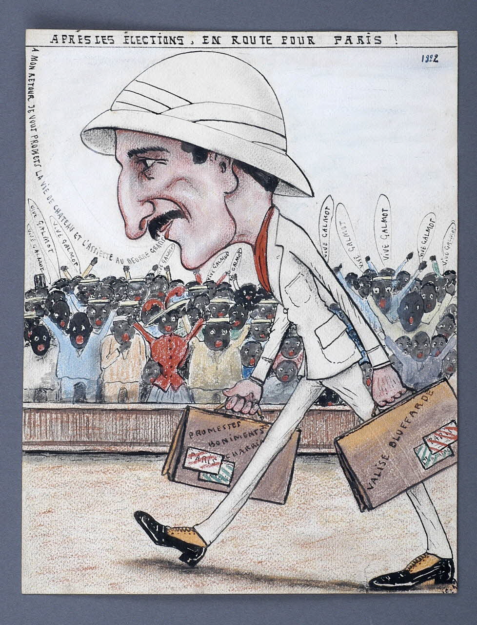 Portrait charge de Galmot partant pour Paris, valises en mains, plein de promesses, devant une foule de noirs l'acclamant.Inscriptions