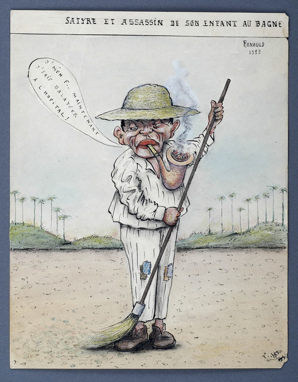 Portrait en pied du bagnard Renauld devenu balayeur à l'hôpital du bagne, représenté avec son balai, fumant la pipe.Inscriptions
