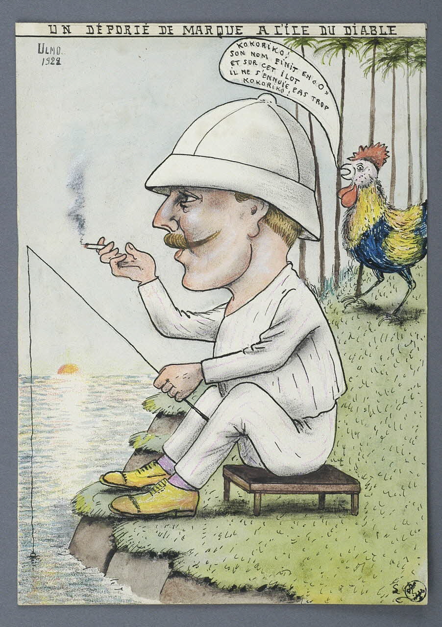 Le bagnard Ulmo, enseigne de vaisseau condamné pour trahison, est caricaturé en train de pêcher tranquilement à la ligne, la cigarette à la main et le casque colonial sur la tête.Inscriptions