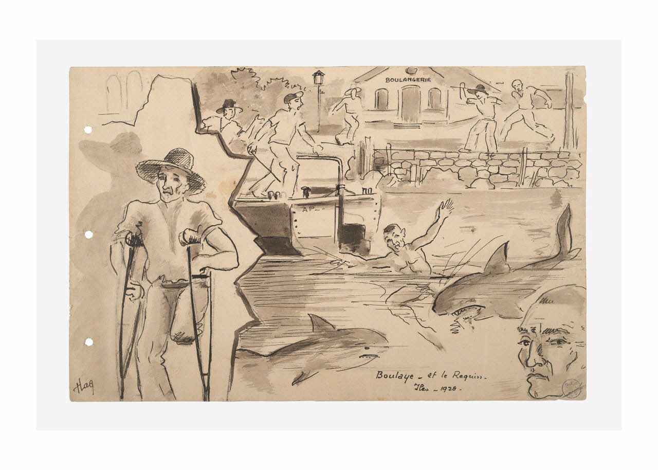 partie d'un ensemble de dessins, Boulaye - et le Requin - Iles - 1928.