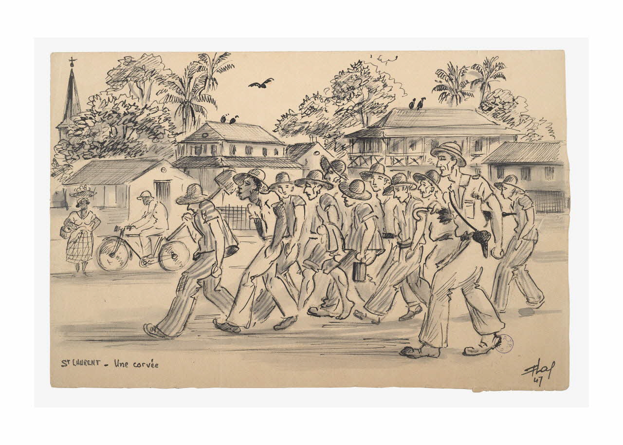 Un groupe de bagnards marchent dans une rue de Saint-Laurent pour aller à la corvée.Inscriptions
