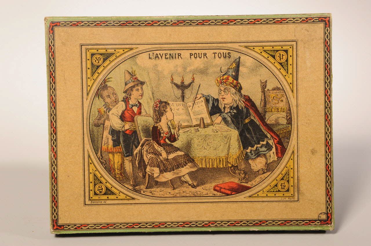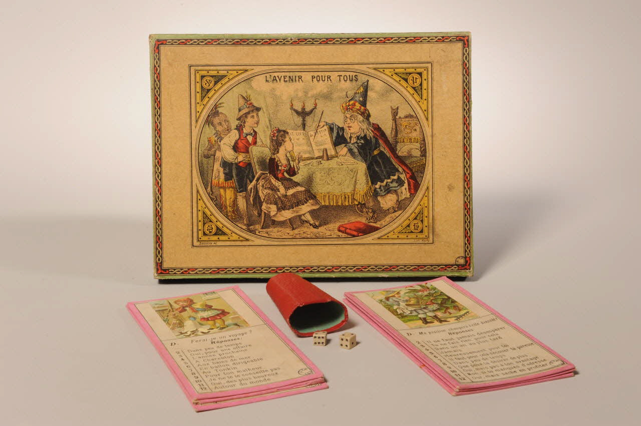 2003.22.4.1 et 2 : boîte 2003.22.3 à 8 : planches de carton imagées 2 dés en bois non marqués 1 gobelet à dés en carton rouge non marquéDécor