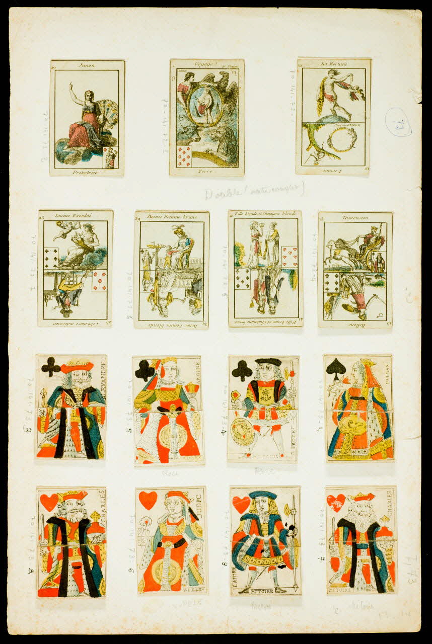 - Figures : femme : reine, couronne, robe, sceptre, homme : valet, lance, trefle : carte