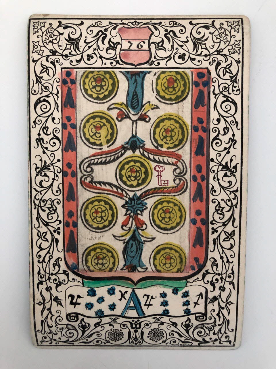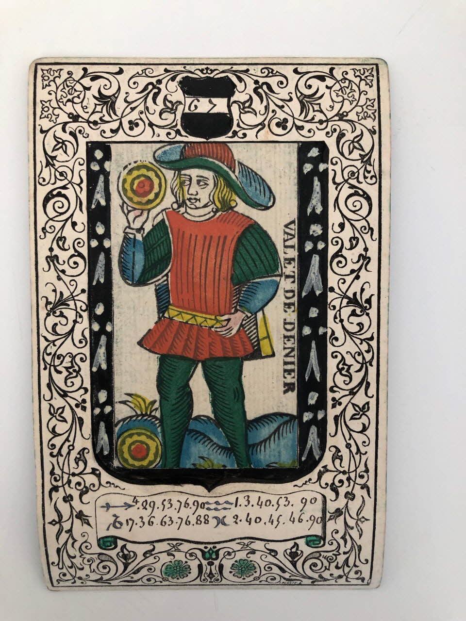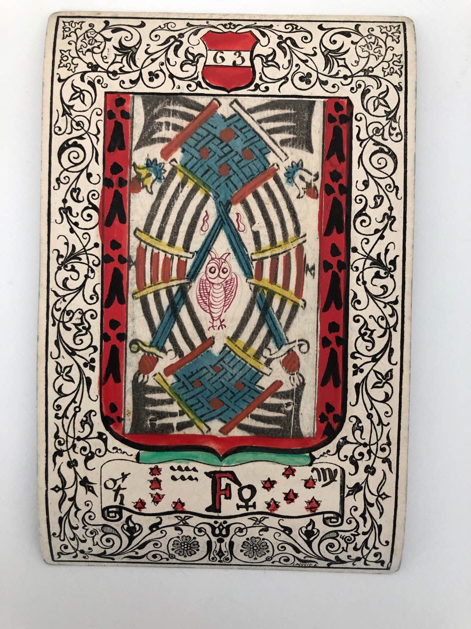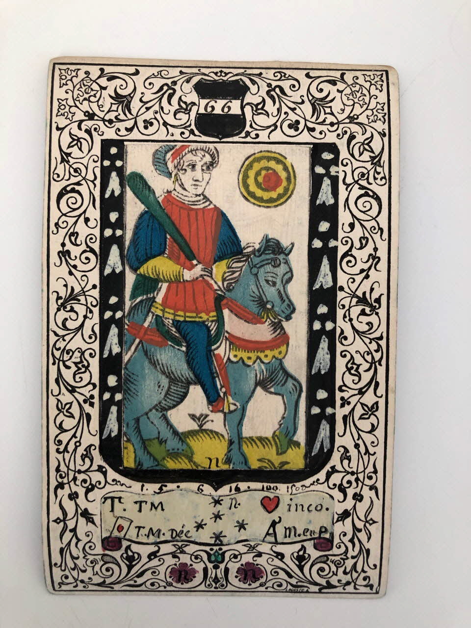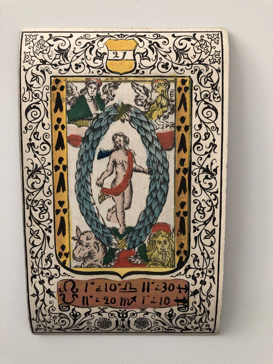 Lieu : Paris, Ile-de-France, FranceUtilisateurs :Il s'agit probablement du jeu personnel du Mage Edmond (Jules Charles Ernest Billaudot, 1829-1881), dont Marcel Belline a hérité les archives. Belline a utilisé les tarots d'Edmond et s'en est inspiré pour l'une des versions de son Oracle. Il a également donné au musée des "Notes abrégées" d'Edmond sur la cartomancie et un "Manuel de cartomancie à l'usage des gens du monde" provenant également du mage.