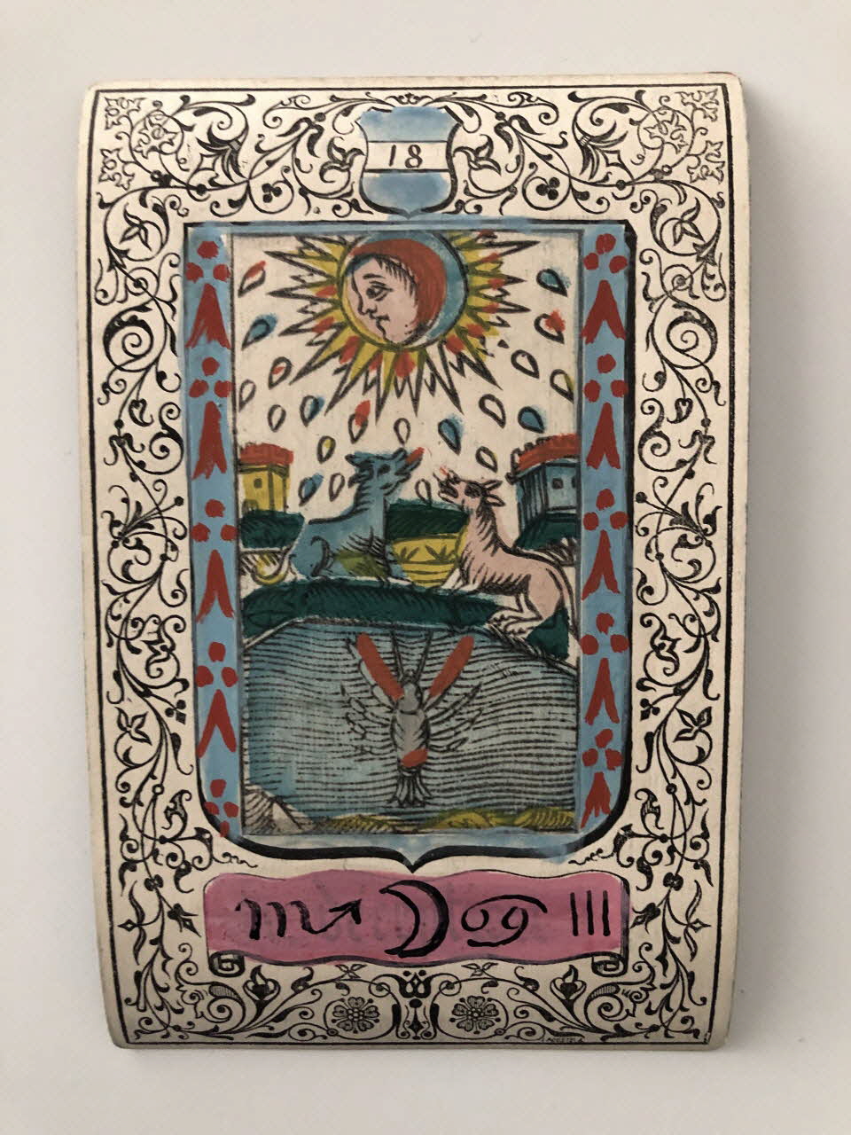 78 cartes de tarot collées sur carton, dans un étui.Décor