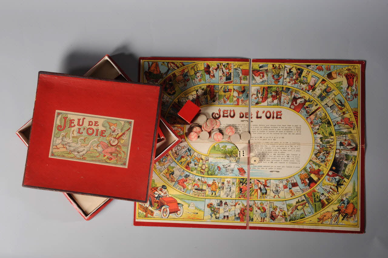 1992.23.8.3 : plateau de jeu avec 2 dés, 1 boîte de rangement et ses 29 jetons. Le plateau de jeu est composé de 63 cases numérotées et disposées en spirale. Dans ces cases figurent une suite de scènes caricaturales représentant des savants, artistes, artisans et des oies déguisées. Les règles du jeu sont présentées au centre de la spirale.Inscriptions