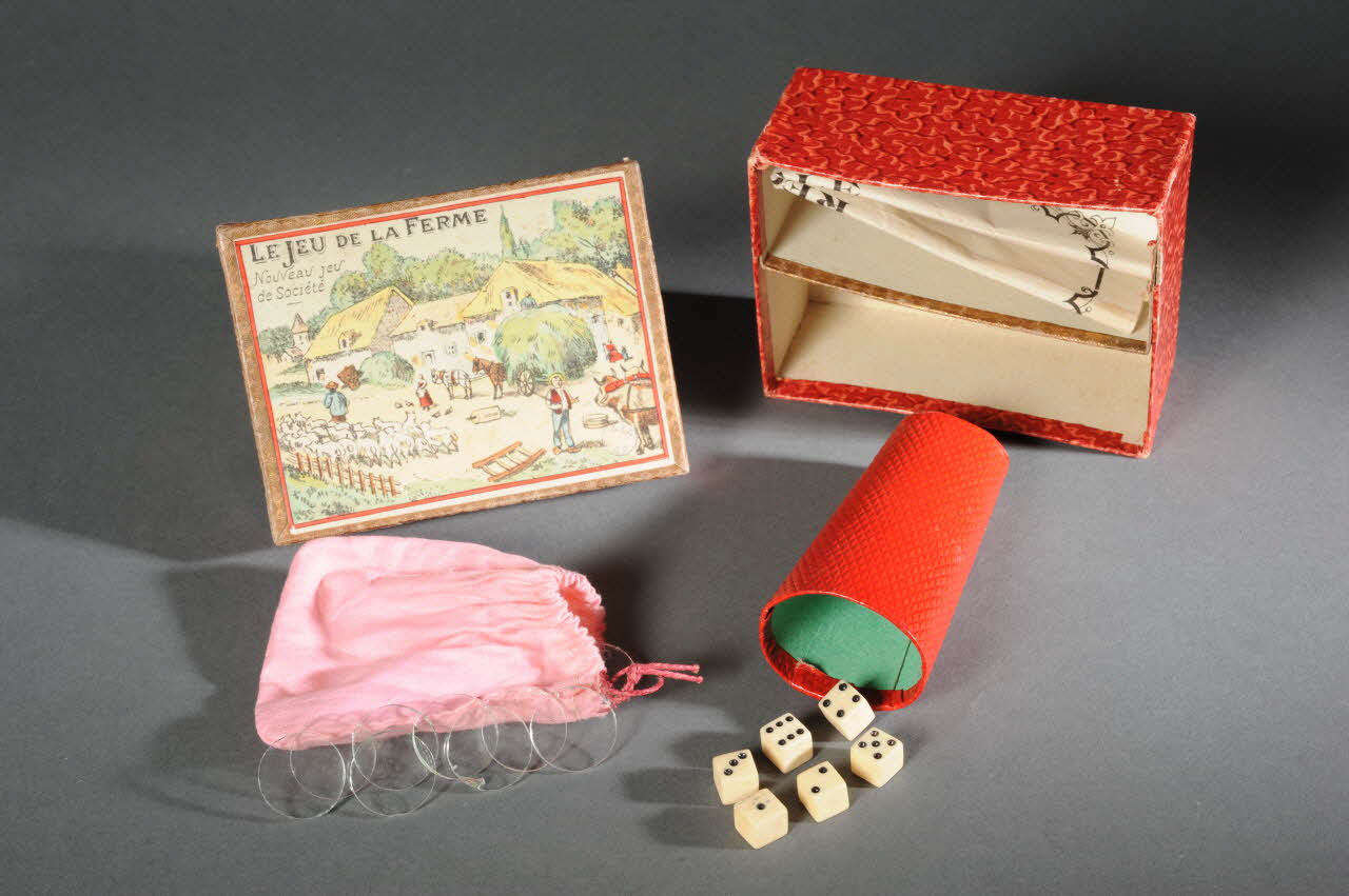 992.23.10.1 et 2 : boîte 992.23.10.4 : règle du jeu 6 dés, 9 pions, 1 gobelet, 1 bourse non marquésDécor