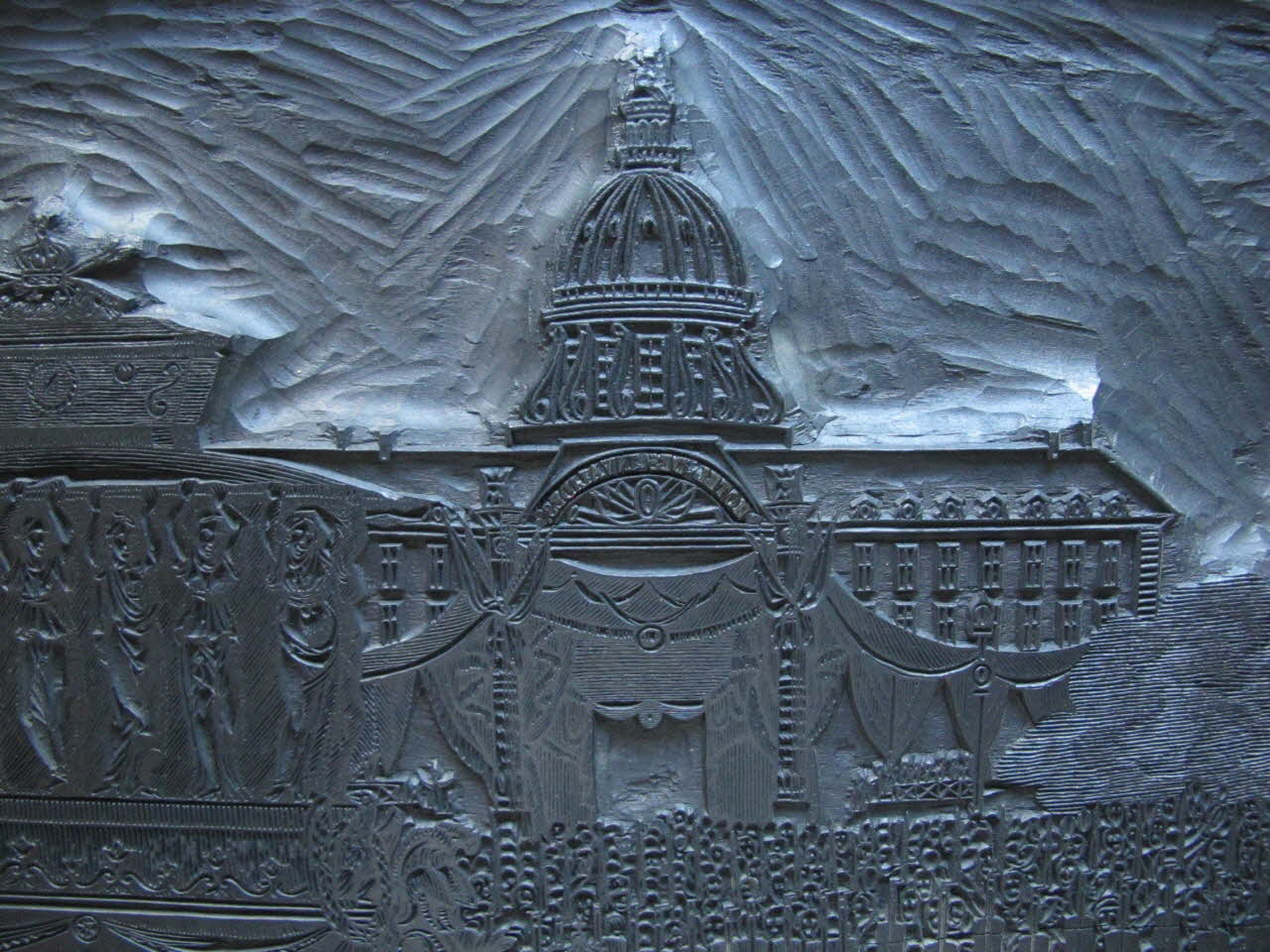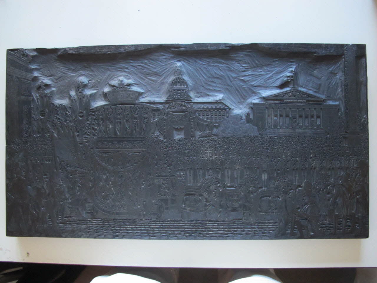 - Scène historique : architecture urbaine, foule, soldat, autel, carrosse