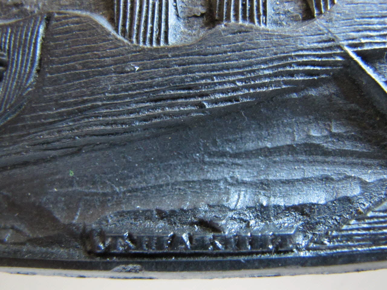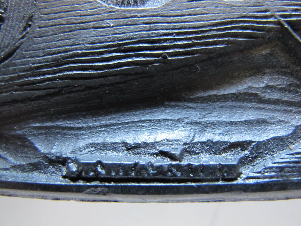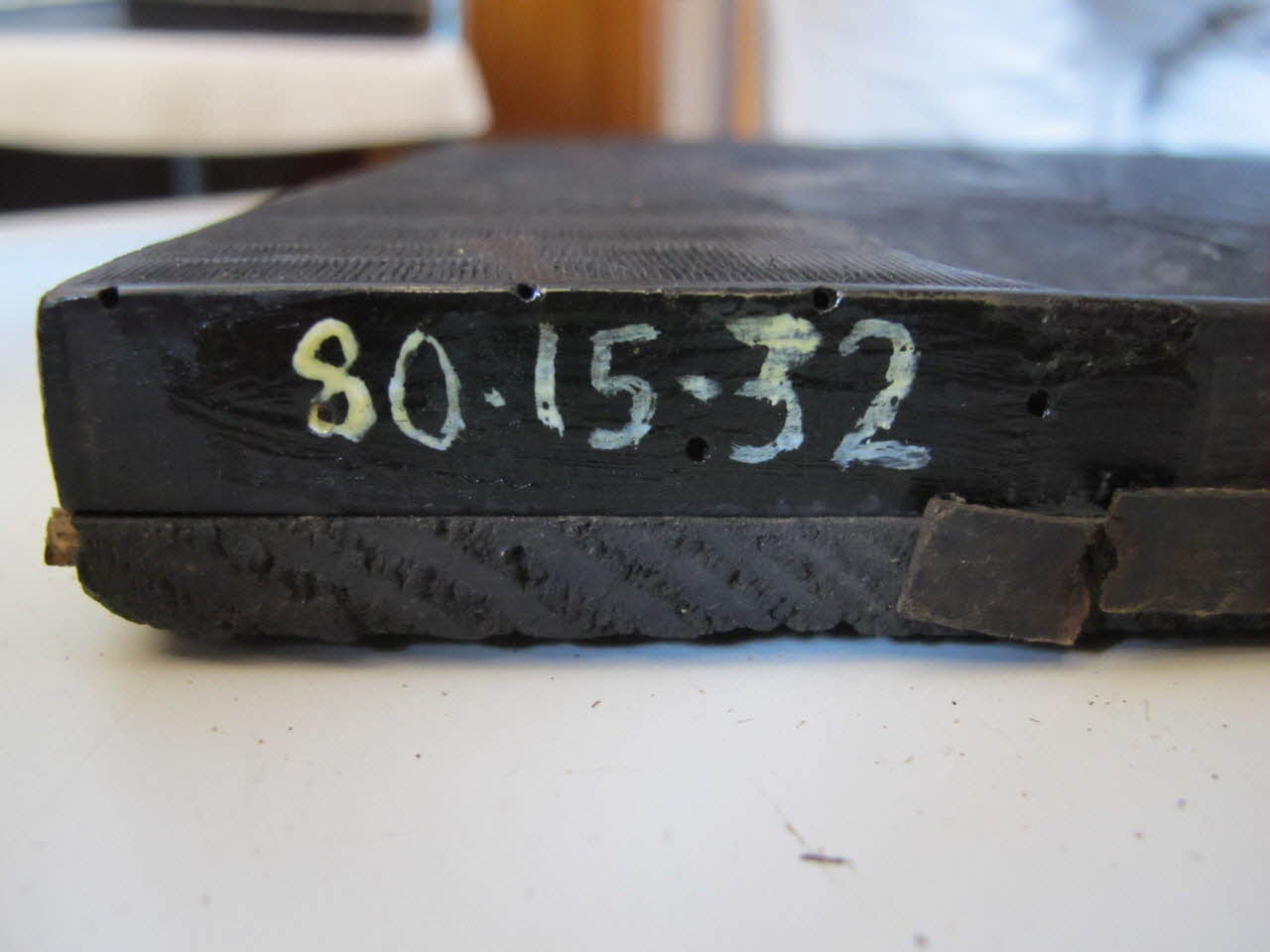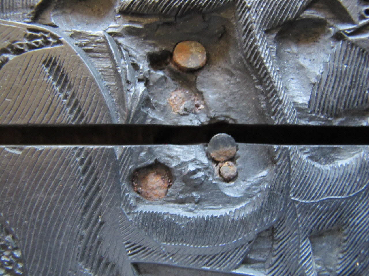 - fixé avec des pointes, complément en carton cloué, la partie sculptée (10 mm) feuillu homogène de fil fibres horizontales en 2 planches assemblées à joint vif, clous