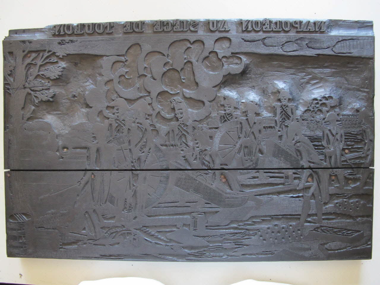 Bois d'impression pour l'estampe NAPOLEON AU SIEGE DE TOULON signée Georgin pour Pellerin à Epinal.Décor
