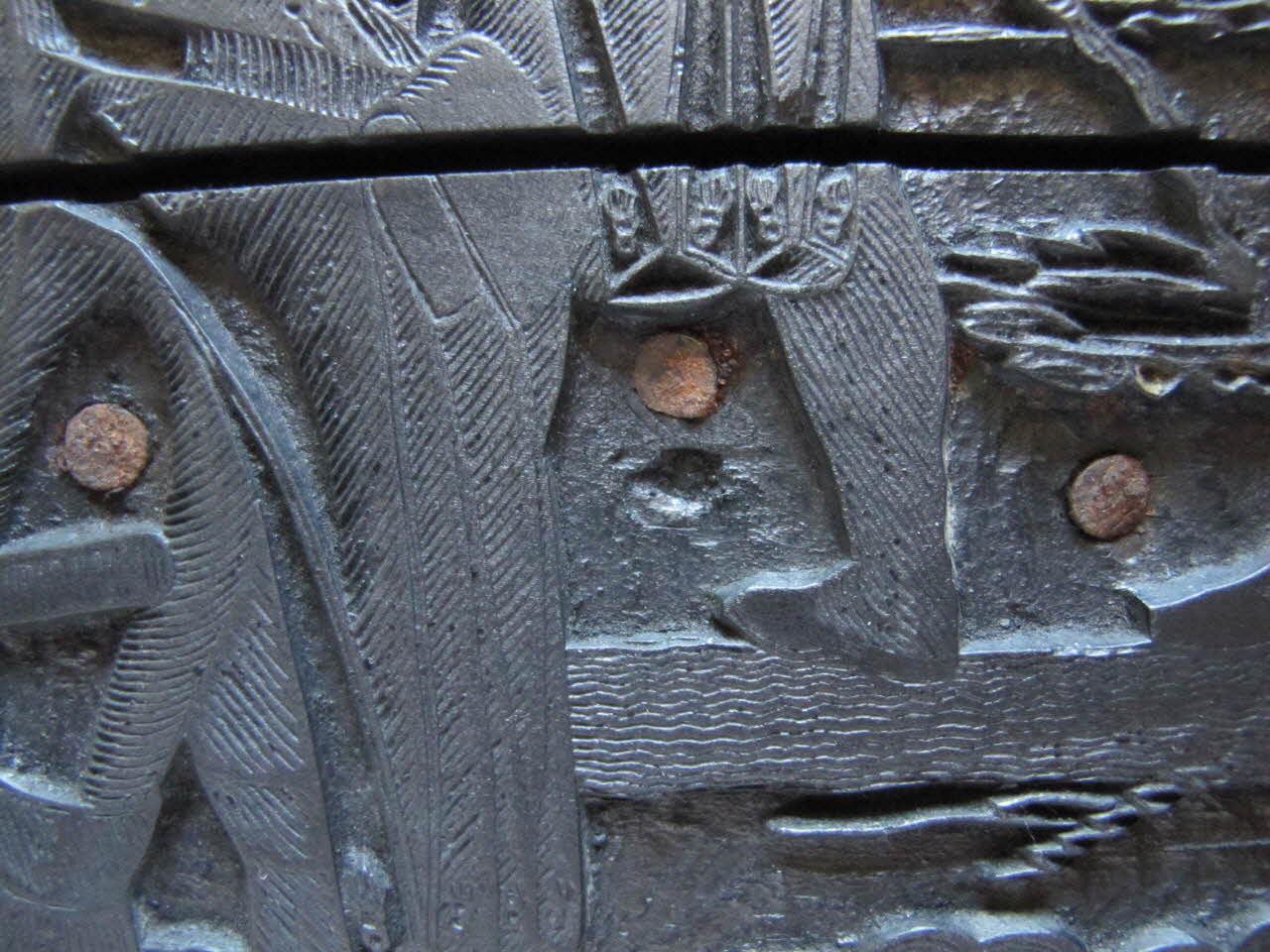 - la partie sculptée feuillu homogène de fil fibres horizçntales, 2 planches à joint vif renforcé p)ar 2 traverses (3-4 mm )à queue d'arronde