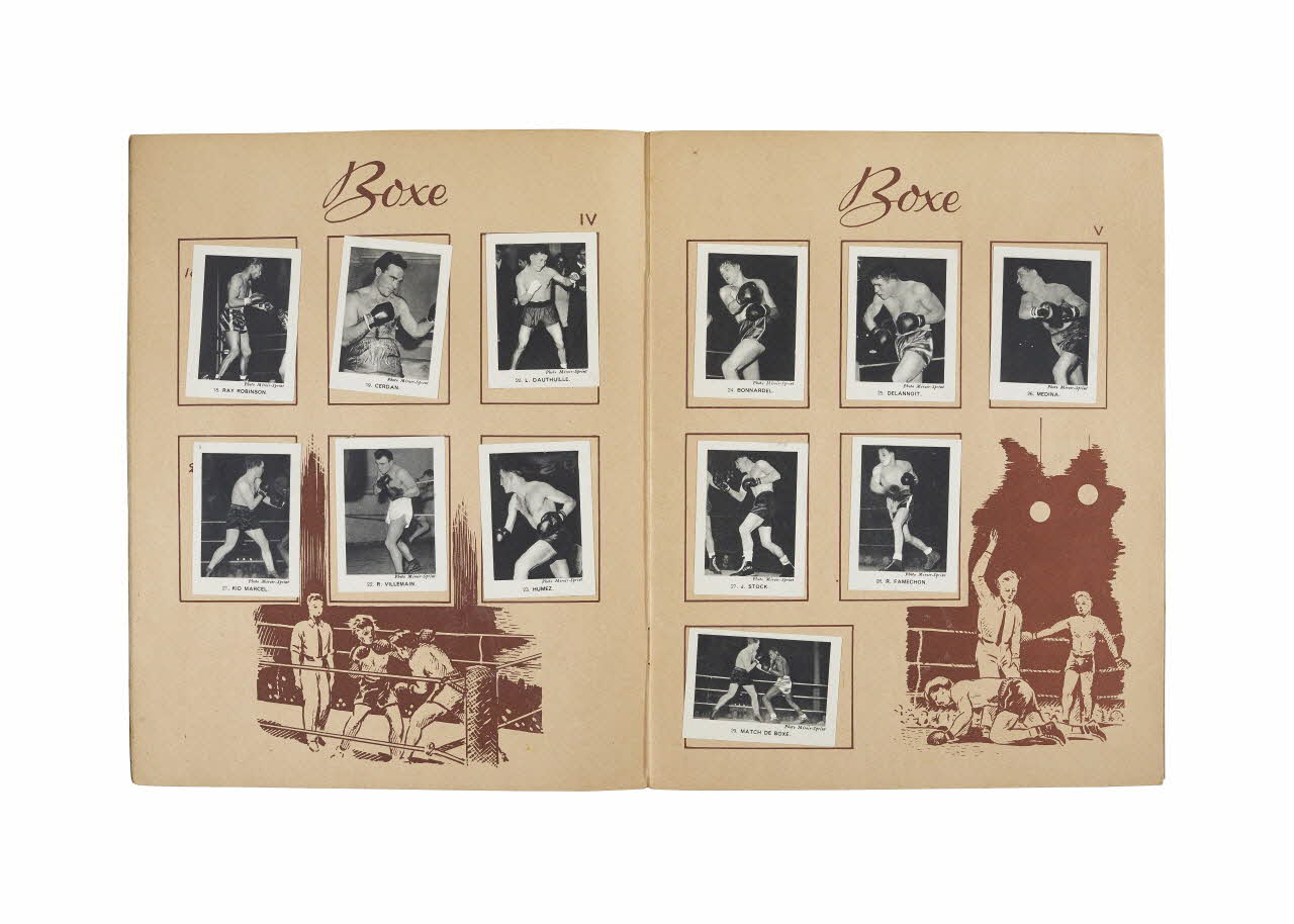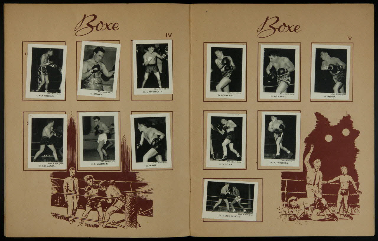 Album de 87 images comportant 16 pages. Ces images en noir et blanc montrent différents sports : cyclisme, boxe, aviron... L'album est incomplet.Décor