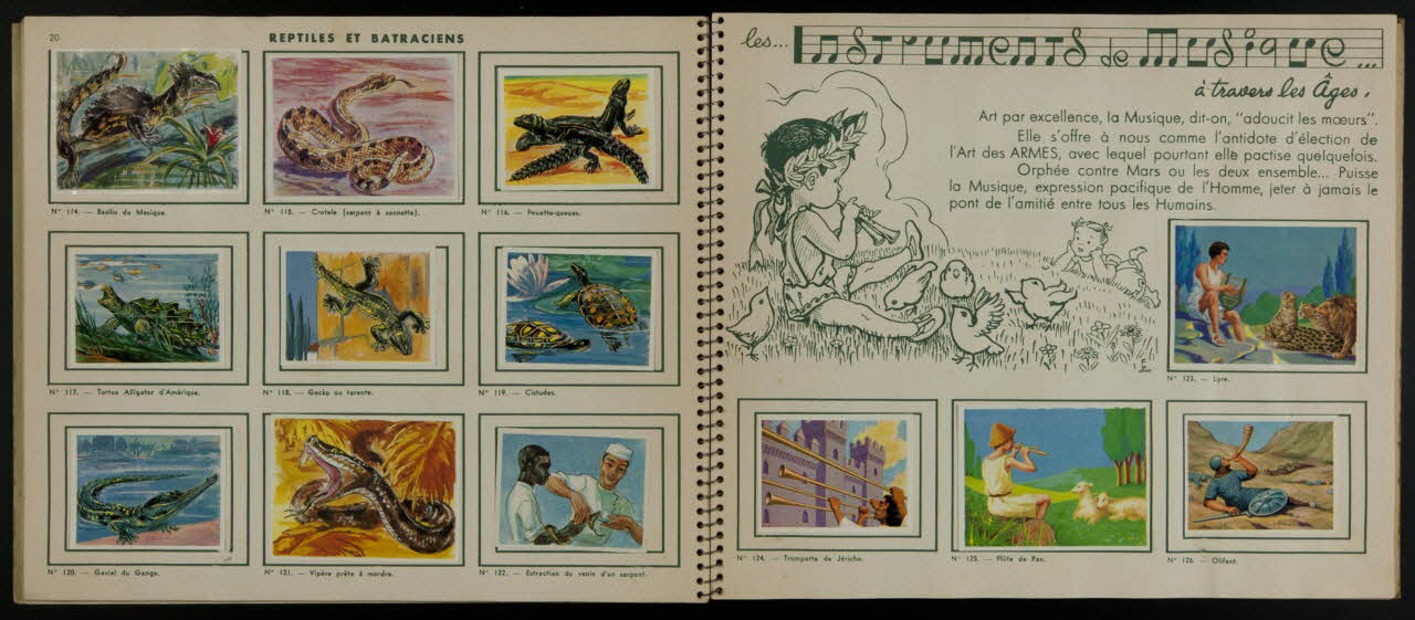 Cet album complet de 44 pages et 300 images. présente différents thèmes introduits par un texte : instruments de musique, jeux antiques et sports modernes, armes de guerre.Inscriptions