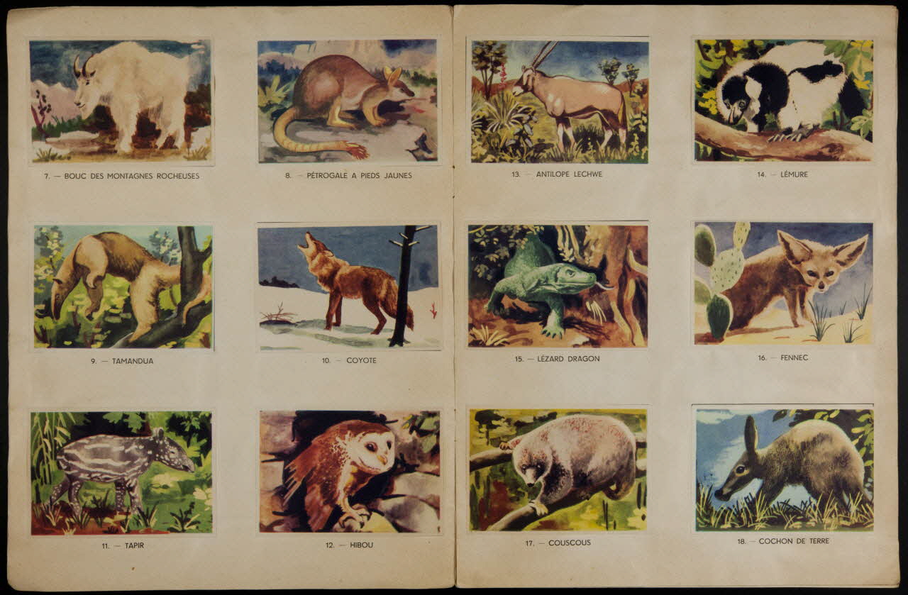 Album sur le thème des animaux. 8 pages, 47 images. Incomplet (manque 1 image).Inscriptions