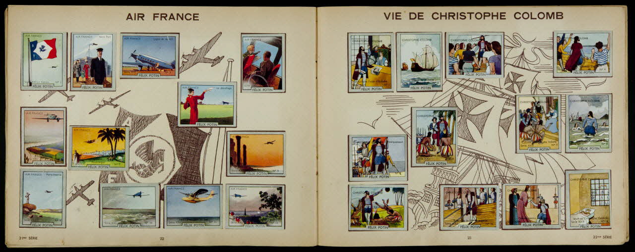 "Cette nouvelle collection comprend 30 séries totalement inédites, sujets instructifs et amusants présentés d'une façon artistique et attrayante [...] 3000 primes d'une valeur de plus de 100.000 frs viendront récompenser les plus actifs collectionneurs, ceux qui auront adressé leur album complet avant le 31 décembre 1935 à la société Félix Potin"Décor